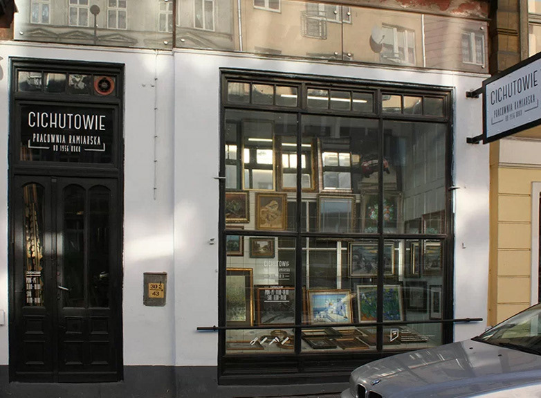 Design of a shop window for a framing studio located in the historic district of Wroclaw.